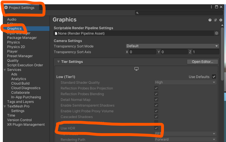 Try playing. If it still looks the same, HDR may be "off" in the graphic settings. Go to Project Settings, Graphics, and check: if HDR option is on (in all tiers, here I'm showing 1 of 3).