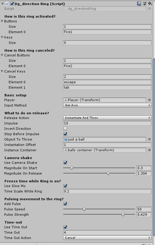 Here you can set which buttons (like "Jump", "Fire1") and keys (like "space", "enter") will trigger this ring.